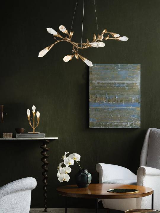 With a warm copper finish and handcrafted natural cloud crystals, the Crystal Ember pendant brings subtle grandeur to your interiors. At 850mm in length, this linear light is ideal for over dining tables or entryways, providing a gentle 3000K ambiance through its integrated LED system. A refined design that radiates understated luxury.