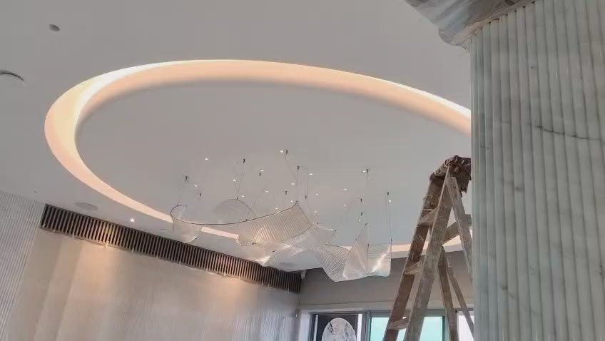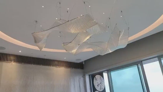 Introducing the Crystal Veil Chandelier – a captivating sculptural light that flows like a cascading ribbon through space. Crafted from premium clear glass and metal, this chandelier adds graceful movement and luminous elegance to expansive interiors without overwhelming the room.