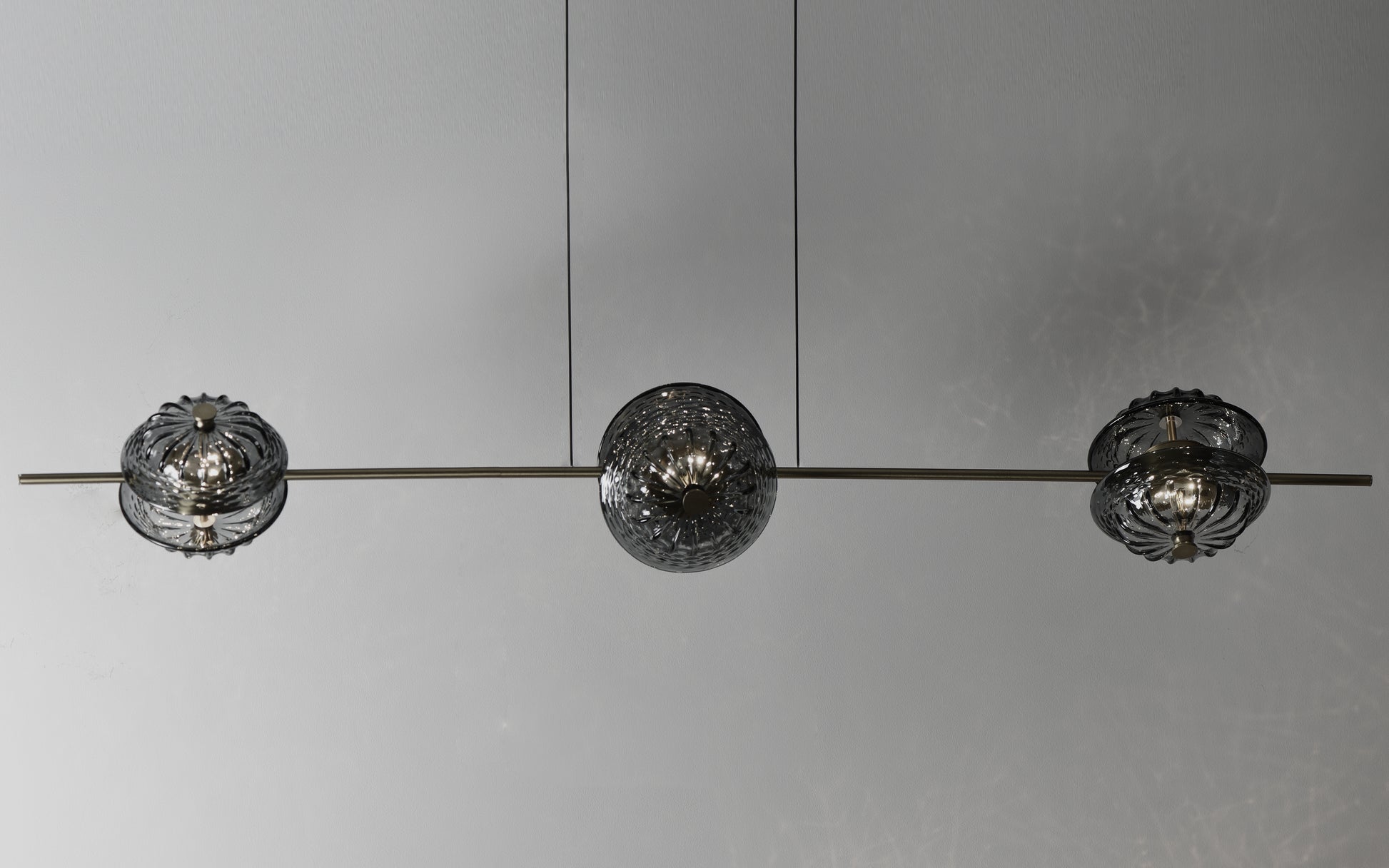 The CrystalVeil Trio is a luxurious linear pendant featuring three smoky crystal glass diffusers suspended from a brushed gold aluminum-iron frame. This elegant fixture delivers a soft, ambient 3000K glow, perfect for enhancing upscale interiors with a blend of modern minimalism and classic sophistication.